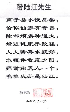 凡尊重中國古代養生智慧的患者,堅持“已饑方食”和定時主動補水者,均可祛病康復。如牡丹江醫學院87歲的張鵬圖飲用半年后高血壓未痊愈,陸江與他通話交流,了解他原先每日主食4兩,建議他用“已饑方食”減少主食肉食量,他理解后,將每日主食減為3兩,少吃兩塊肉,飲用一年治愈26年的冠心病和高血壓。他2003年5月31日來信說:“飲用卓康小分子團水是根治高血壓、冠心病、糖尿病的一把金鑰匙,是填補醫學空白,為人類造福,應推廣該產品?!?/strong>