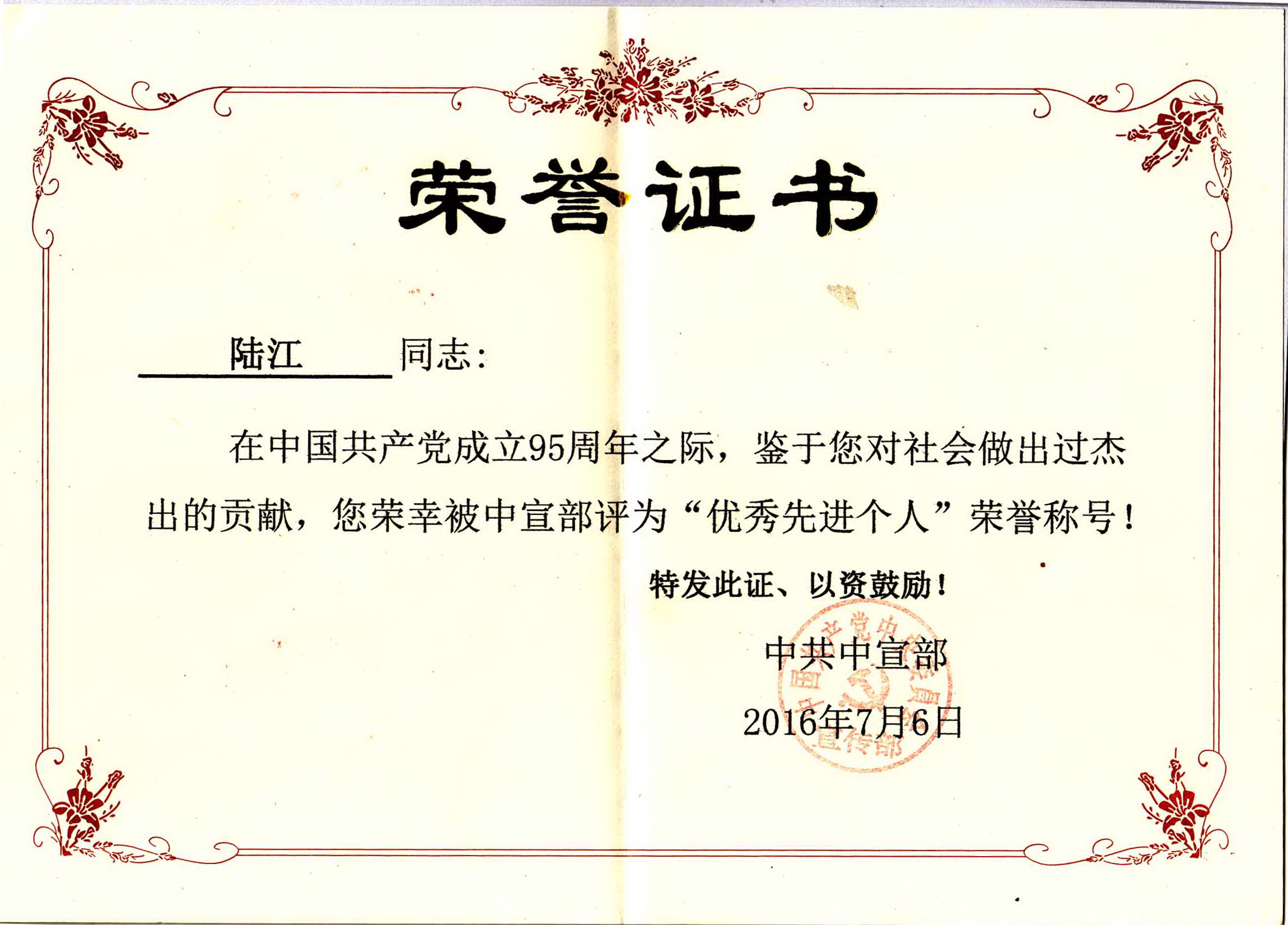 陸江的論文獲一等獎榮譽證書-- 陸江論文獲創新論文獎牌