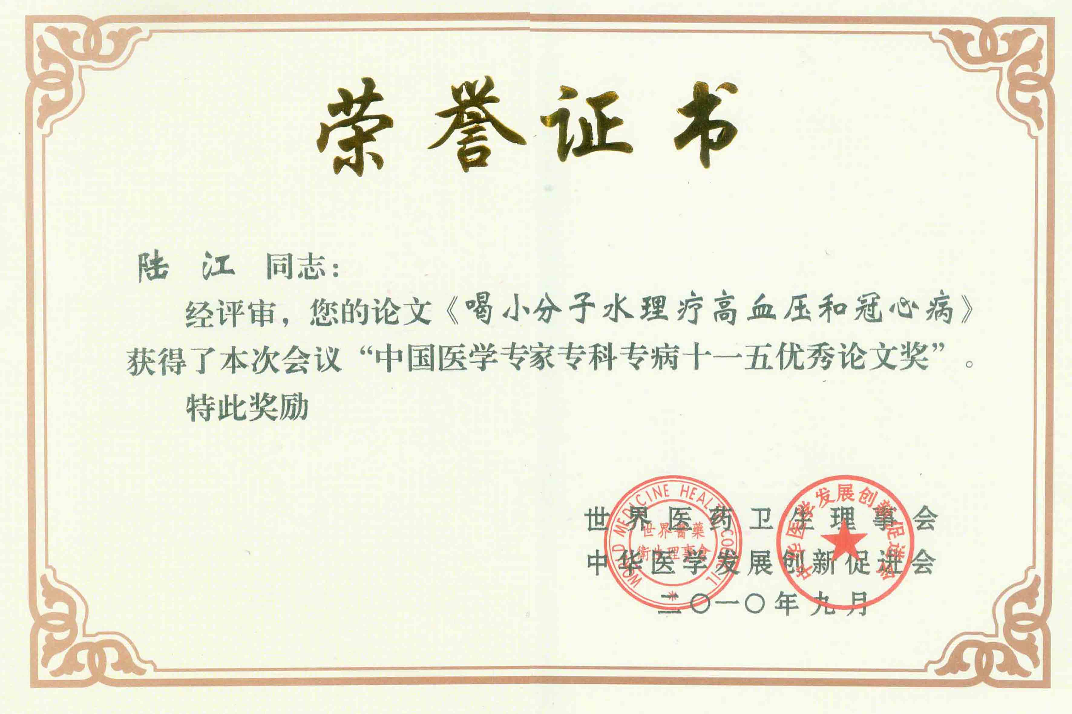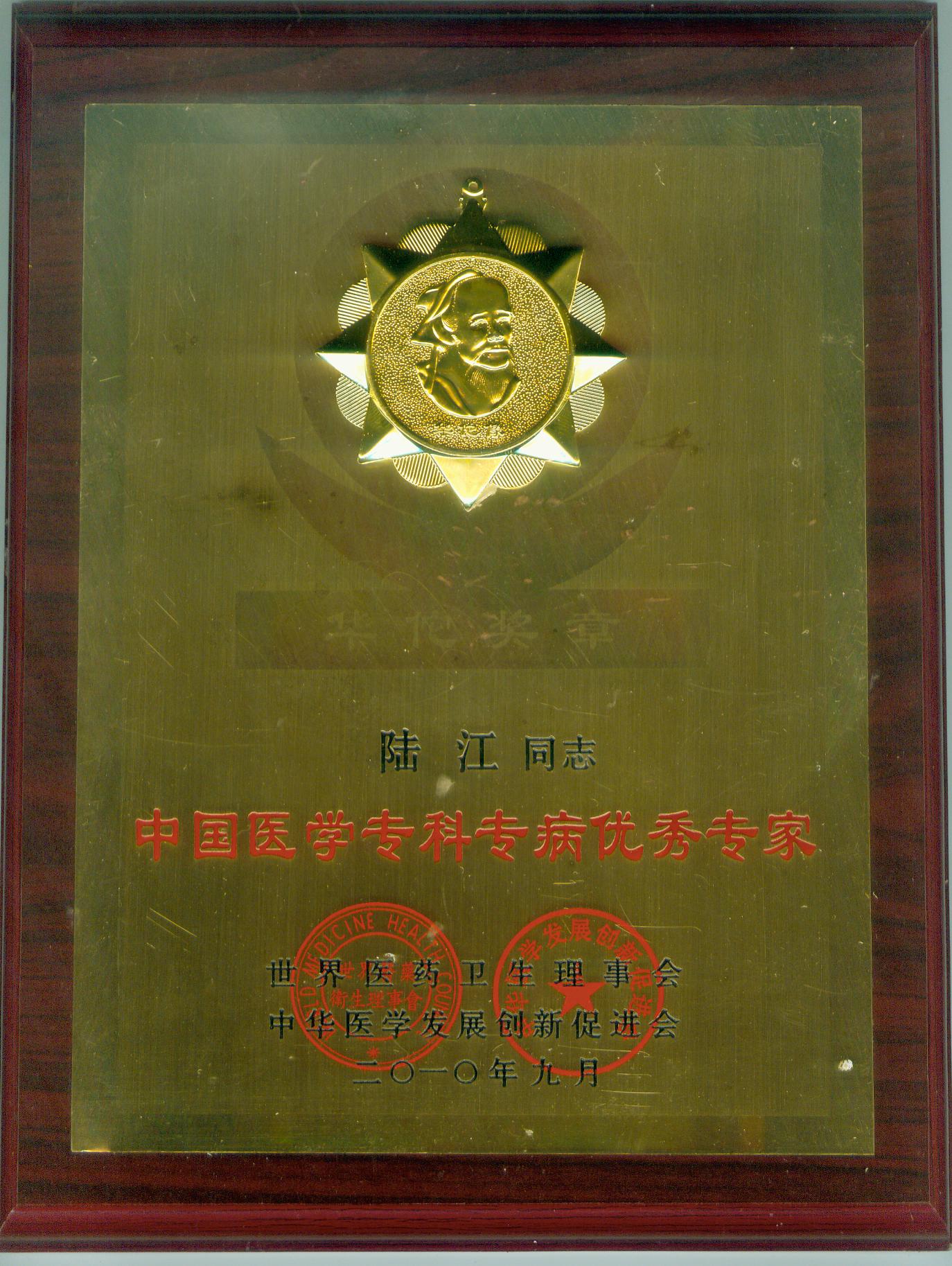 陸江獲得中國醫學專科專病優秀專家恃別貢獻獎