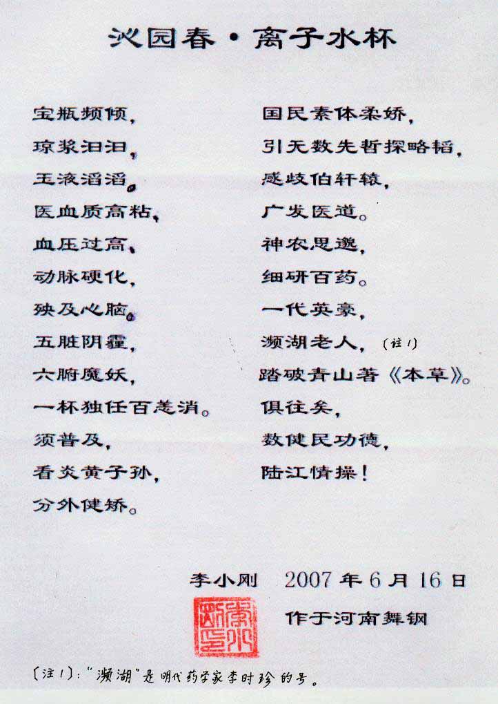 -----我是從事建筑的高工,本來沒有資格去攻克醫學難題,卻為了自身健康才扣響醫學的大門。由于我1990年患高血壓,因怕中風才研究發明了離子水瓶,我把水處理成微小分子團水,飲用后治愈了高血壓。便于1993年底送到三家省級醫院做臨床試用4個月。經北京和廣西醫學專家鑒定:"降脂降壓效果好"," 能擴大心腦動脈流量,改善心腦電圖以及微循環","對治療心腦動脈粥樣硬化、高血壓、高血脂有良好的醫療保健作用。""產品的技術性能和療效達到了同類產品的國內領先水平,經廣西醫學科學情報研究所檢索,未見國外有類似報道。"中國醫學科學院張正國教授從美國國立醫學圖書館數據庫存Medline檢索英俄文資料,均未見類似報告。2000年上市后,我為了對消費者負責而繼續觀察研究,一直通過《信譽卡》和《質量跟蹤調查書》向患者承諾療效,請用戶使用6個月后反饋效果。和脂壓患者飲用2至5個月內,消除癥狀,停服藥物,血壓正常;冠心病患者飲用3~5個月逐漸減輕至消除心絞痛、房顫等癥狀,不再服藥,飲用1年左右心電圖正常,經冠脈造影掃描無明顯狹窄,表明冠心病痊愈。大量患者還反映許多衰弱器官被修復,讓前列腺增生、慢性咽喉炎、慢性氣管炎、支氣管炎、慢性胃炎、腸炎和膽囊炎等不藥而愈;2型糖尿病患者是因為胰島衰弱致病,飲用該水半年至一年,逐漸減藥至停藥,血糖尿糖正常,真正治愈2型糖尿病。中風后遺癥患者飲用六七個月,可逐漸減輕至消除肢體和語言障礙,表明飲用該水能讓壽命很長的神經元細胞逐漸修復,奇跡般地恢復肢體和語言功能。飲用后還使胸腺和脾臟兩個重要的免疫器官被修復和增強,產生免疫細胞多,提高了免疫力,使人不生病或少生病。自此, 飲用微小分子團水創造了攻克冠心病、高(低)血壓和糖尿病三大醫學難題的奇跡。人們對此感到不可思議,但實踐是檢驗真理的唯一標準。